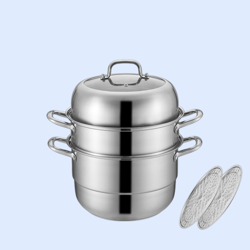 304食品グレードのステンレス製多層蒸し器。二層・三層選択可。家庭用・IH対応、耐久性と清潔さを両立。多用途調理に最適。