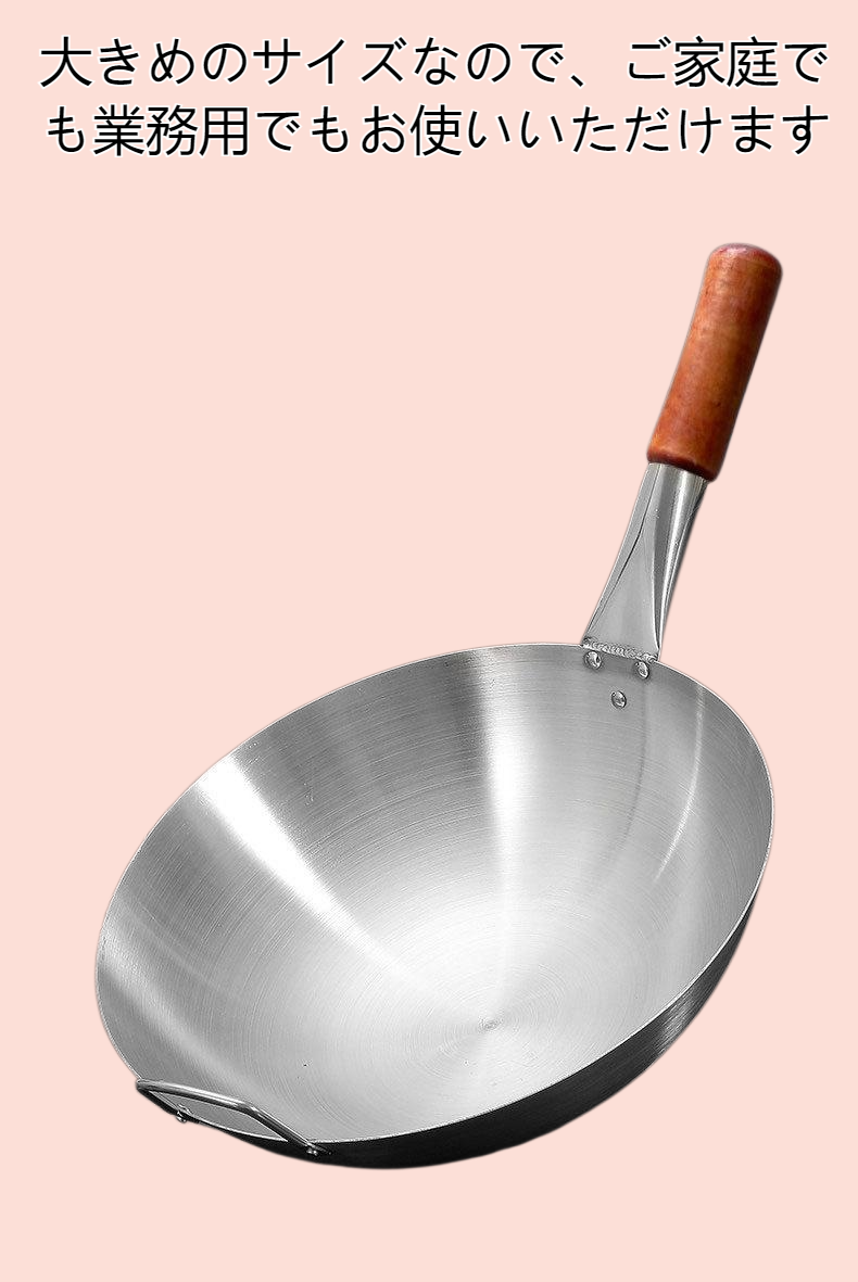 両耳と丸底のステンレス製フライパンは、木製ハンドル付きで持ちやすく、炒め物や煮込みに最適。大型サイズで家庭用や業務用に対応。
