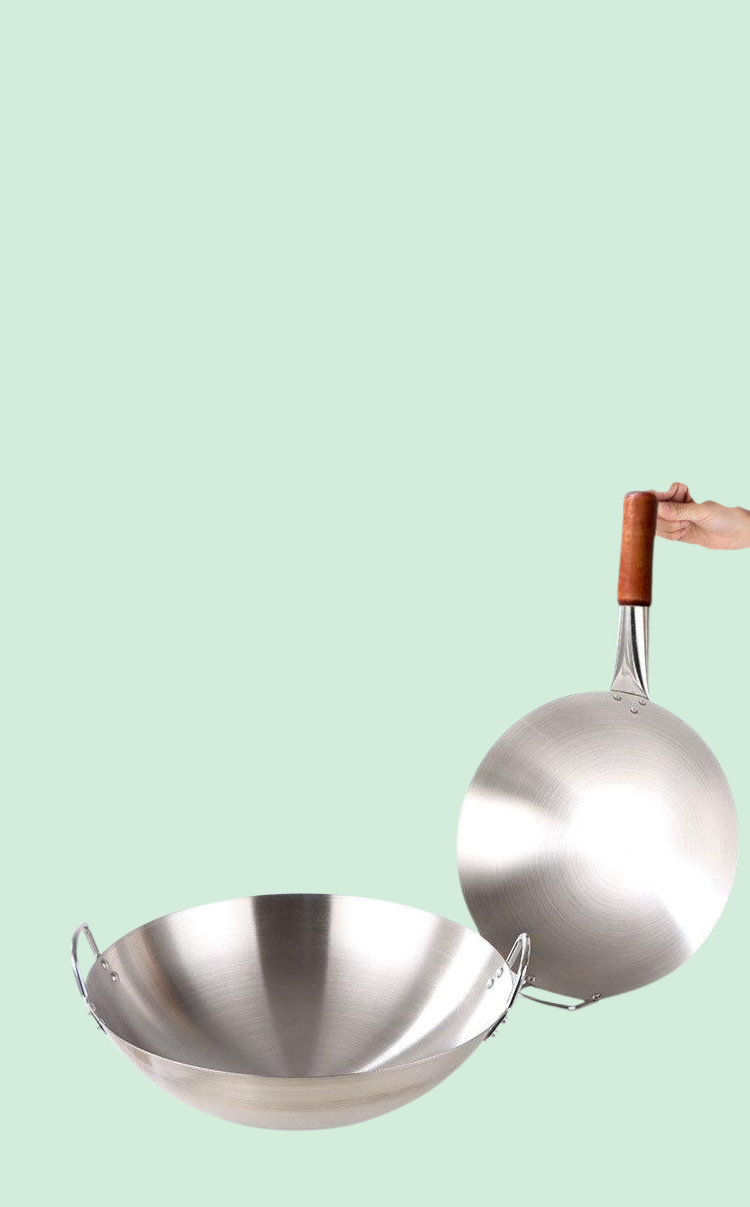 両耳と丸底のステンレス製フライパン、木製ハンドルと片手ハンドル、フライパン、大型大鍋、炒め用大鍋、田舎風大鍋
